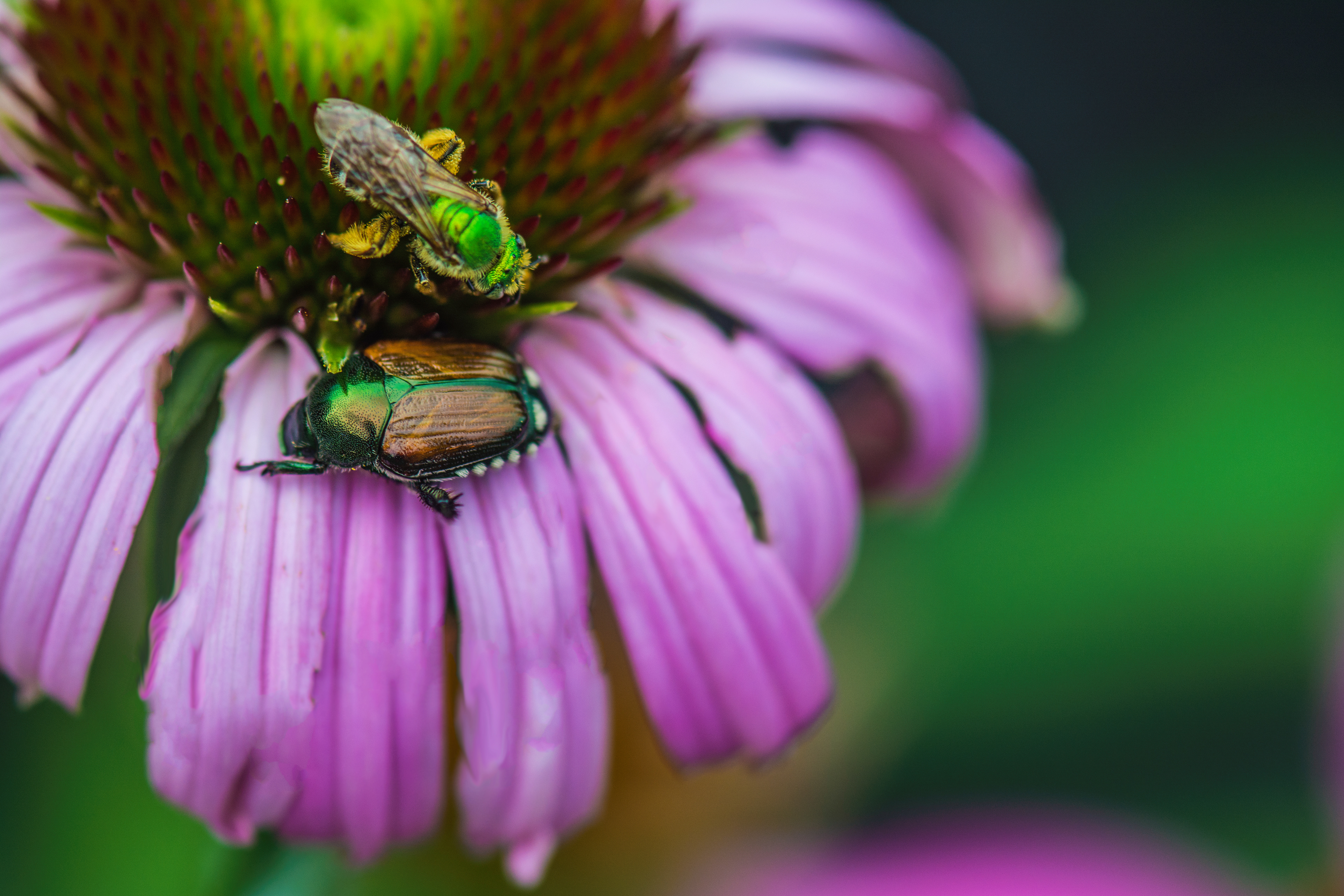 A bright green fly, and a Chinese Emerald Beetle sharing the same Purple Coneflower.