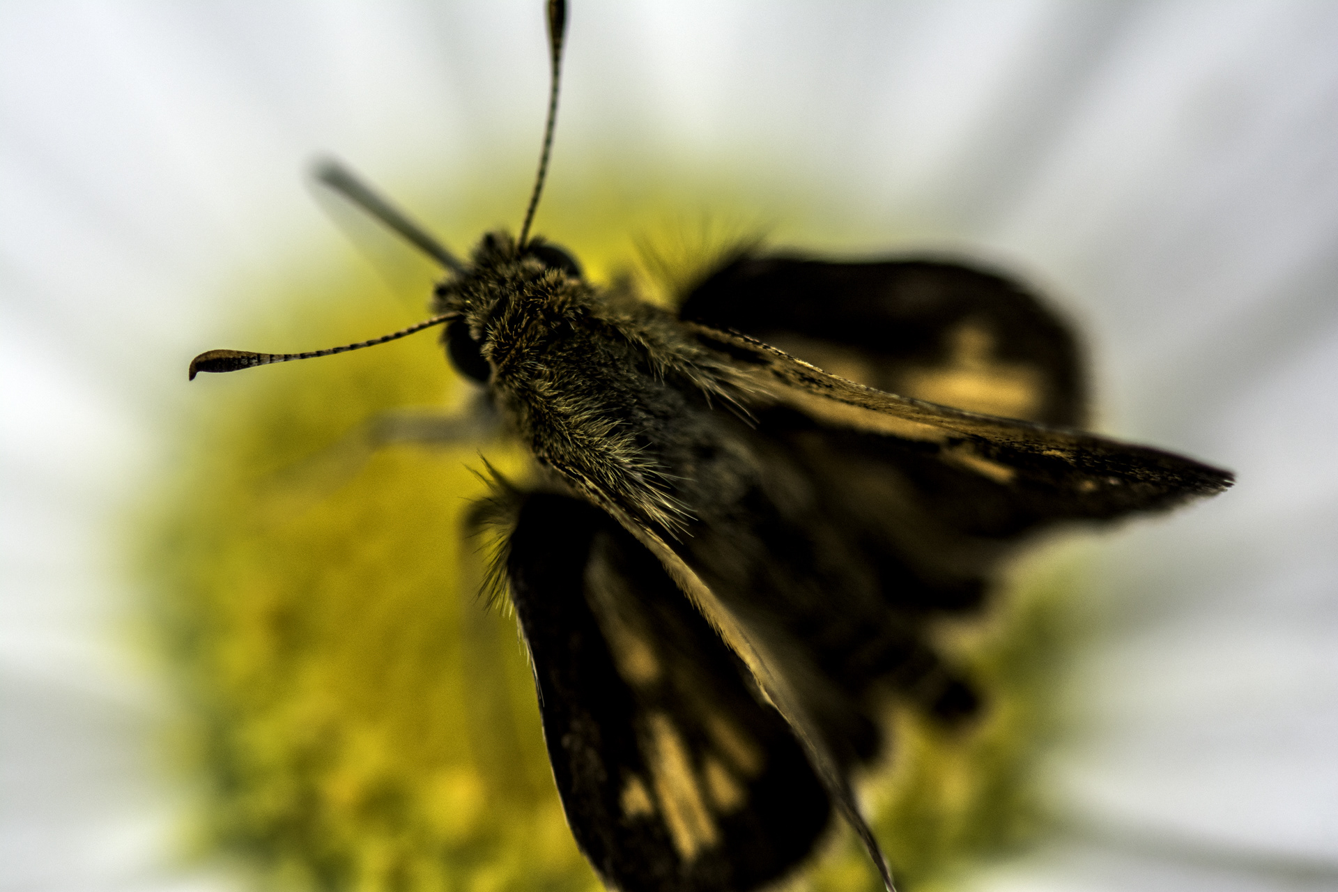A macro shot of a Common Skipper as it sips nectar from a daisy.