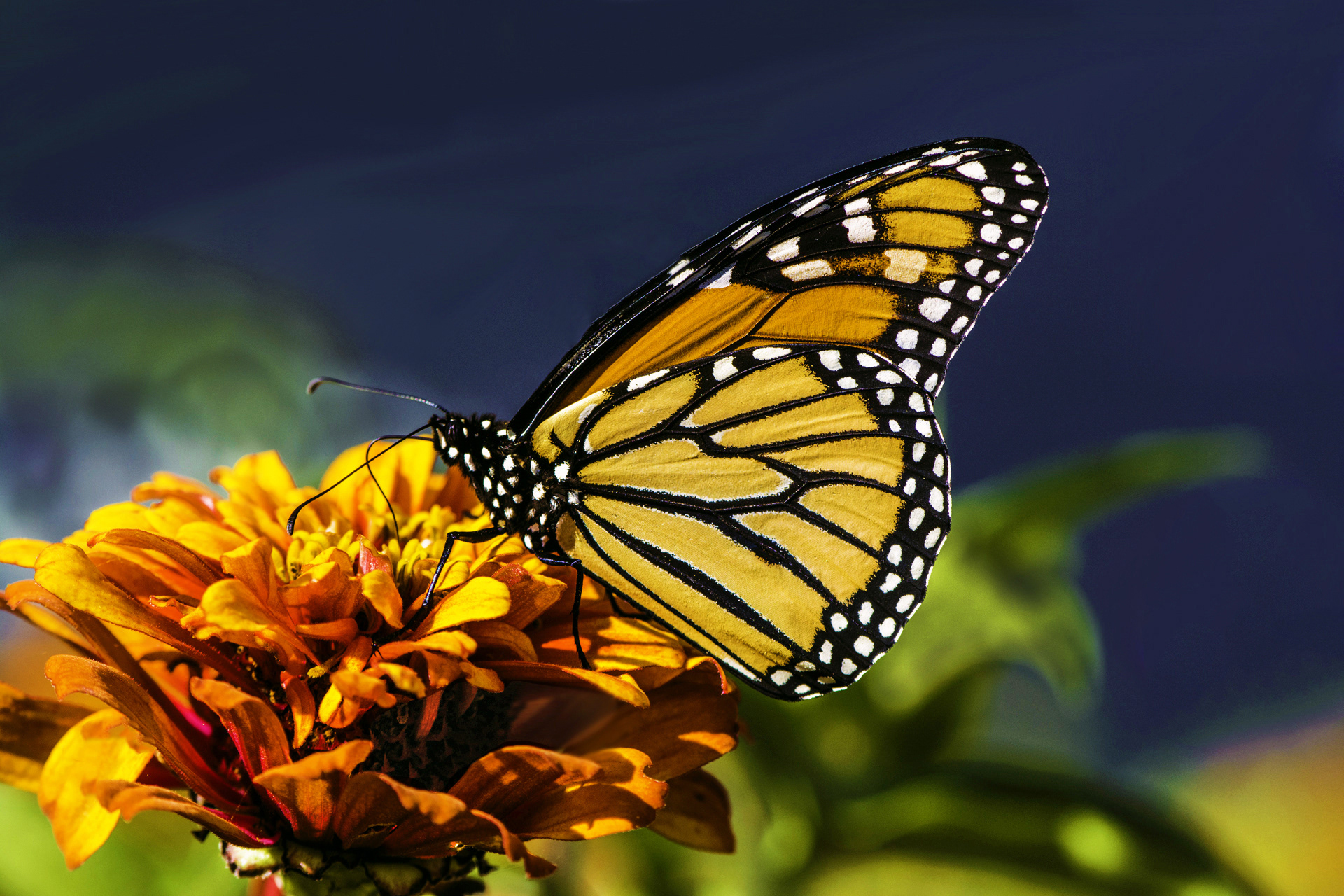 One of North America's greatest treasures, and my all-time favorite photo, the Monarch Butterfly sitting on a Red-and-orange Zinnia.