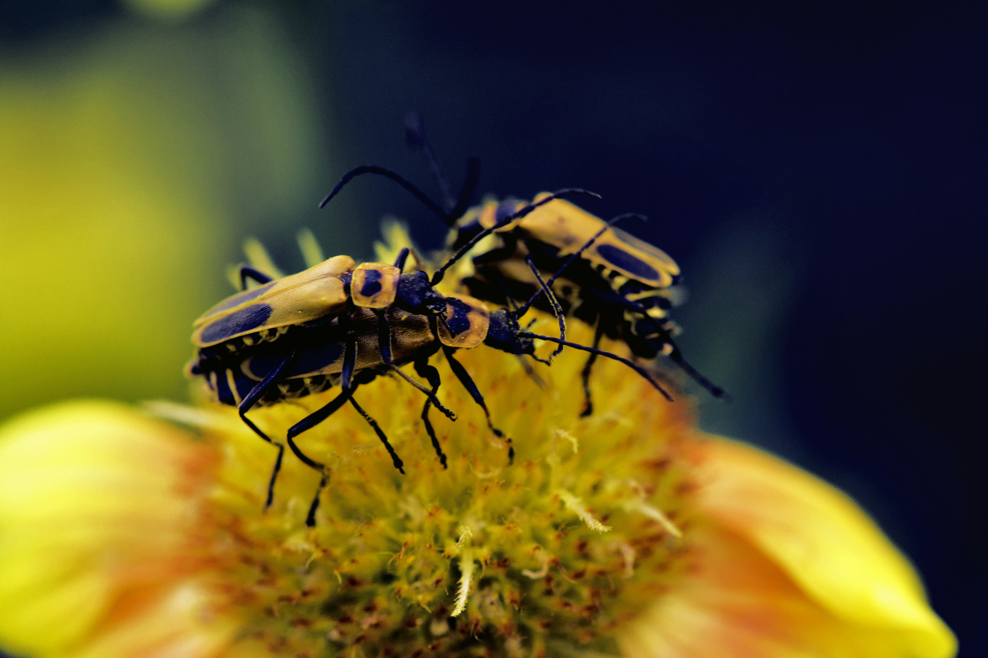 A set of yellow beetles, preparing for the mating season, strategically located on a yellow daisy.